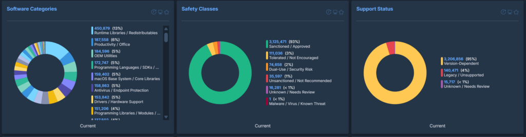In practice, we have found that this content provides critical context when reviewing an organisation’s software inventory. It translates a faceless list of unknown tools into their purpose, how safe they are, and whether they are out of support or not. Individual categories/classes/support statuses can be extracted and monitored either as a report or visualised in a dashboard, allowing for a much-needed and comprehensive summary of what is actually in your environment and what you need to focus on