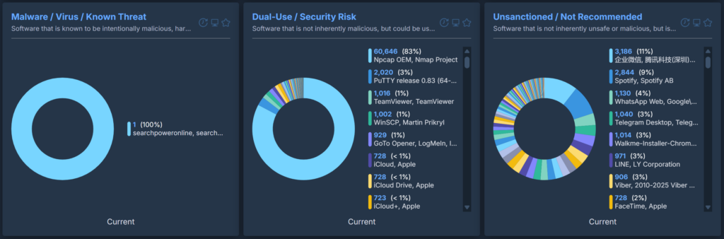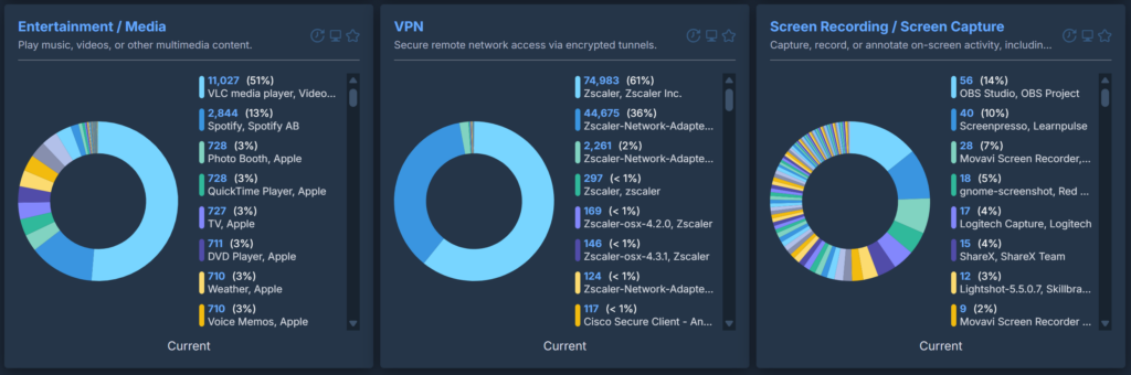 These will sort an entire inventory into very clear categories and can easily highlight software of interest. If an organisation uses a single, standard VPN tool and this content reports dozens of different VPN tools installed across the estate, it is clear that users are installing their own. The same is true for remote access software, password vaults and so on.