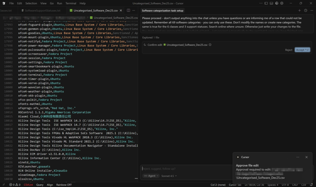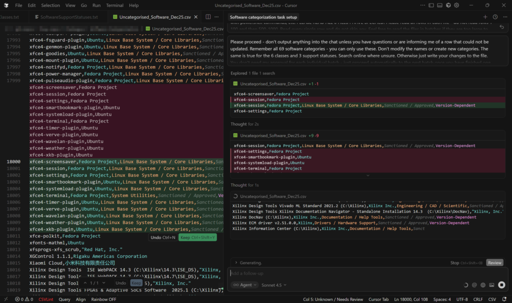The mass-categorisations were done in Cursor with the Claude Sonnet model as opposed to in-browser with GPT-4. This model was far, far better at following specific rules for categorisation criteria and Cursor allowed it to edit the file itself and saved having to copy/paste results. It also allows files to be added as context, meaning the rules for the categories, classes and support statuses could each be saved in their own file and also no longer needed to be copied and pasted into a prompt window. This was also true of the example dataset along with a file of general rules for the categorisation that told the AI model what to do.