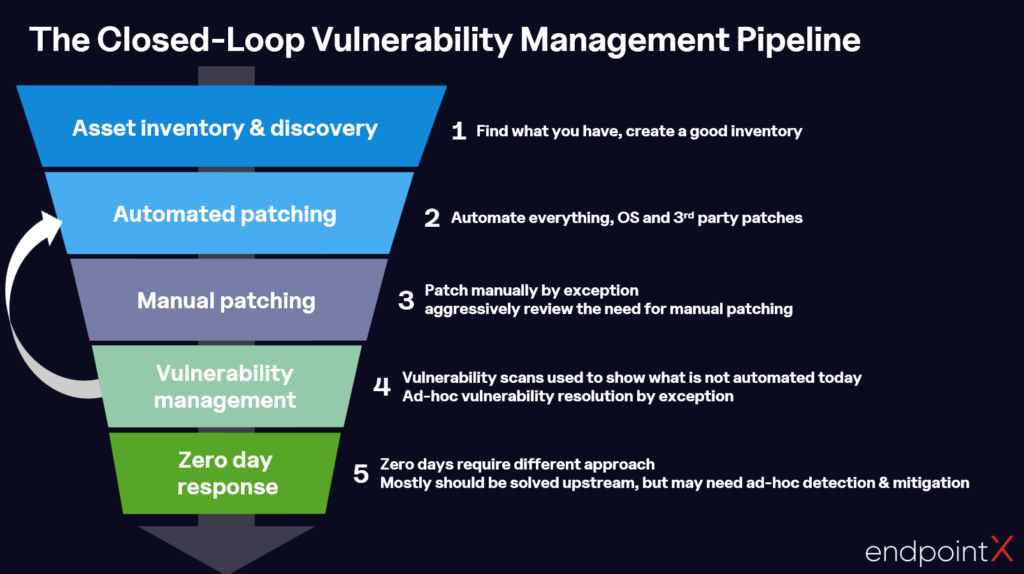 Vulnerability scanning then serves a more targeted purpose: highlighting exceptions. What has not been patched? What fell outside scope? Where did auto-patching fail or not reach? Scanning becomes a verification and escalation mechanism, not the trigger for patching.