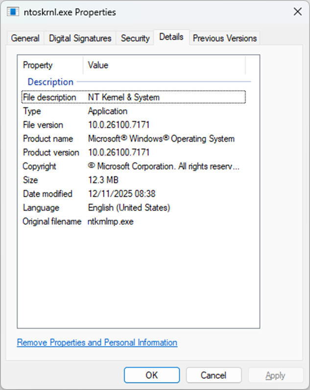 On my Windows 11 25H2 fully patched to November 2025 for example, I can see that the NTOSKRNL.EXE is version 10.0.26100.7171.