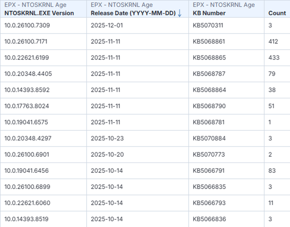 Above is some sample data, now I can tell that any machine running a kernel below version 10.0.26100.7171 clearly isn’t patched to November 2025. Any machine running 10.0.26100.7309 is clearly running a newer kernel.